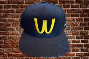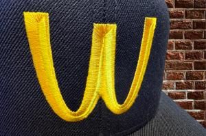 フロントのWロゴは、フラット刺繍ながら立体感を出すため2色の刺繍糸を